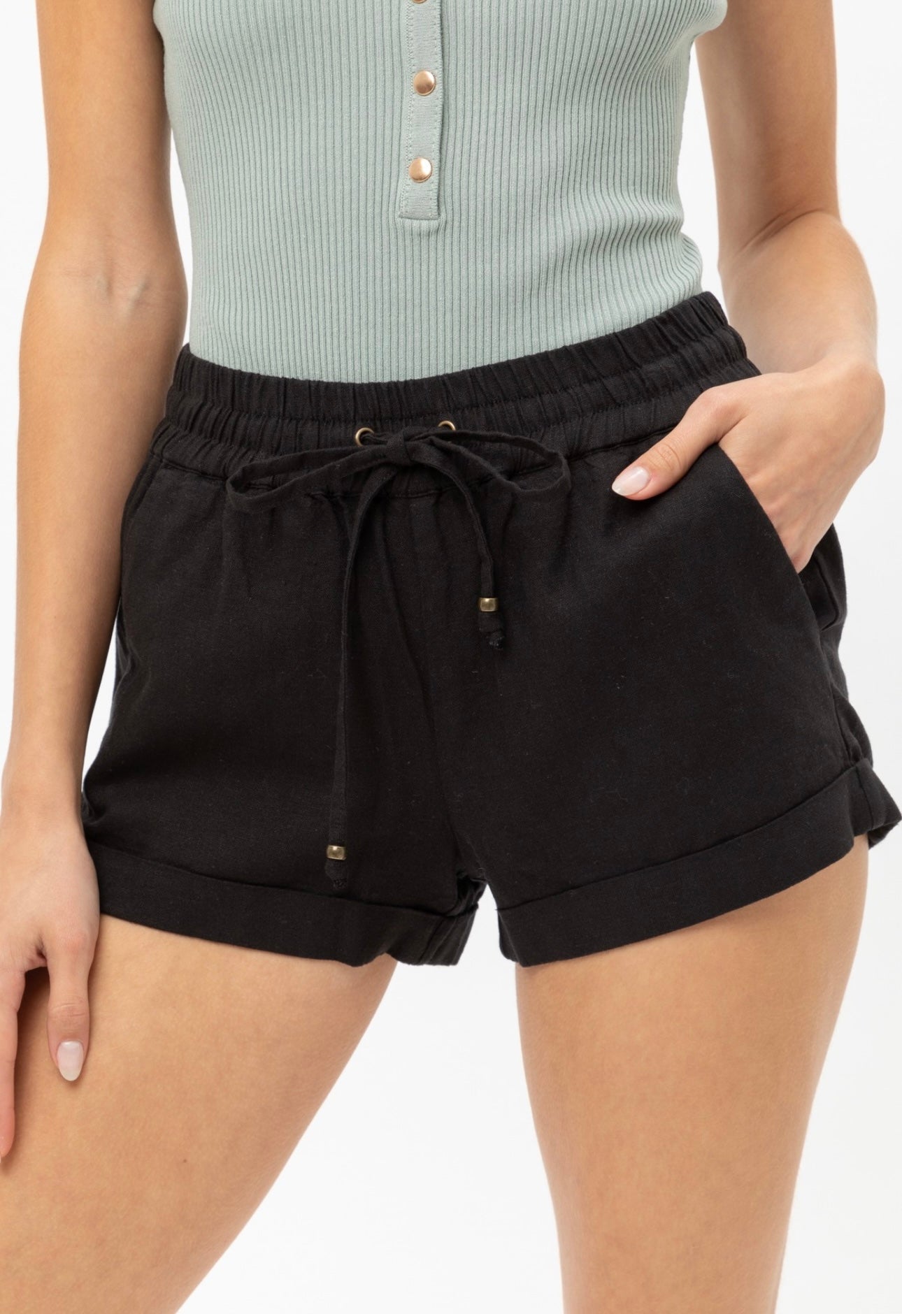The perfect summer linen shorts with elastic waistband, pockets and drawstring tie front.