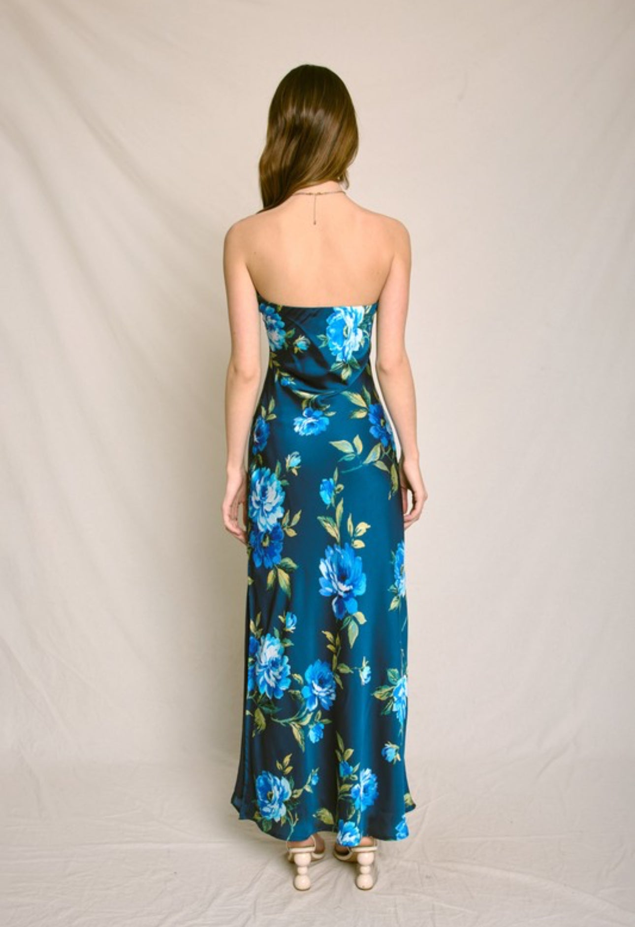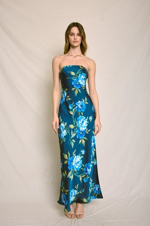 Slip into effortless elegance with the Oceana Bloom maxi dress — a stunning strapless silhouette kissed with rich teal tones and vibrant ocean-blue florals. Crafted from silky satin that catches the light just right, this dress features a sleek side slit and a flattering draped back for an alluring, yet sophisticated look. Perfect for beachside weddings, sunset dinners, or tropical escapes, Oceana Bloom brings a fresh burst of coastal romance to any occasion.
