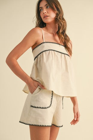 A warm-weather staple with coastal charm, the Salt + Stitch Shorts blends effortless ease with standout details. The lightweight, natural fabric drapes beautifully, while the bold black contrast stitching adds just the right touch of edge. Pair with matching Salt & Stitch flowy cami top, perfect for weekend getaways, market strolls, or beachy brunches. Wear it together or style each piece solo for endless outfit options.