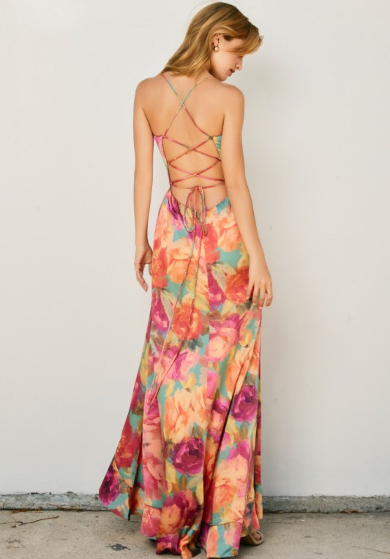 Turn heads in the Sunset in Bloom Maxi, a vibrant floral masterpiece made for twirling at golden hour. With its soft, watercolor-inspired print and cascading ruffle detail, this dress exudes effortless romance. The fitted bodice features a flattering square neckline and flows into a high-low hem that shows just the right amount of leg. The show-stopping lace-up back adds an irresistible touch of allure—perfect for summer soirées, weddings, or a magical night under the stars.
